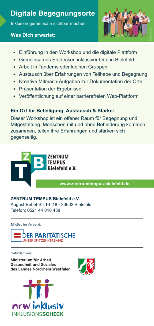 Mach mit und entdecke inklusive Orte in Bielefeld! Du bist mindestens 16 Jahre alt mit oder ohne Behinderung? Dann bist du herzlich eingeladen! In dem barrierefrei gestalteten Workshop machen wir gemeinsam sichtbar, wo Begegnung, Vielfalt und Teilhabe in Bielefeld gelebt werden. Gemeinsam schaffen wir einen Ort, an dem Beteiligung zählt, Vielfalt sichtbar wird und jede Stimme gehört wird!